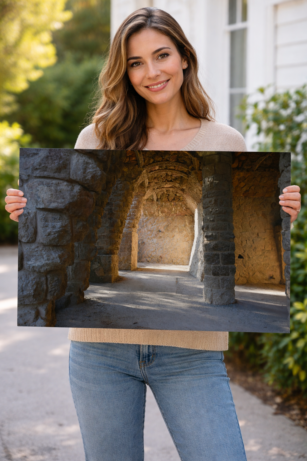 This photograph captures the quiet, timeless beauty of Park Güell’s stone colonnade, where Antoni Gaudí’s organic architecture feels carved directly from the earth. Rough-hewn stone pillars support softly curving arches, creating a rhythmic passageway that draws the eye inward. Warm sunlight filters through the openings, casting long, gentle shadows across the sandy floor and highlighting the rich textures of the stone. The interplay of light and shadow adds depth and calm, evoking a sense of shelter and serenity within the park. The image reflects Gaudí’s harmony with nature—rustic, sculptural, and quietly monumental.