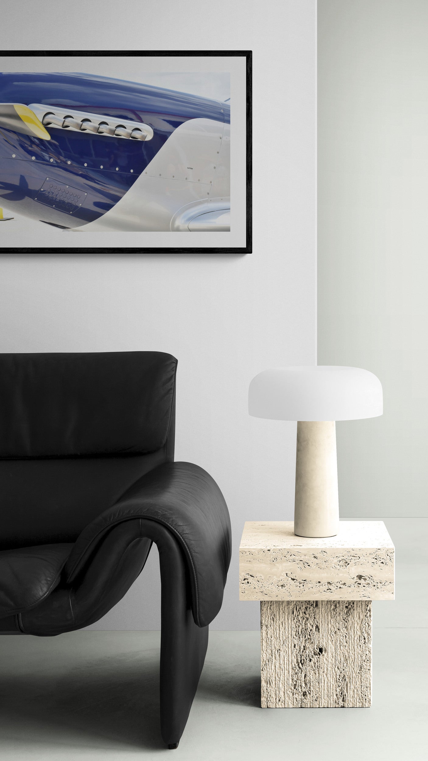 In this abstract close-up, Kim A. Bailey captures the essence of power and motion through the gleaming metal skin of a legendary Mustang aircraft. Focused on the engine exhaust area, the photograph becomes a dance of color and reflection—bold blues, silvers, and flashes of yellow intertwine in a sleek, high-contrast composition. The polished surface distorts its surroundings into fluid, abstract forms, turning mechanical detail into visual poetry. A striking piece for aviation enthusiasts and abstract art collectors alike, this image celebrates both the strength and elegance of flight.