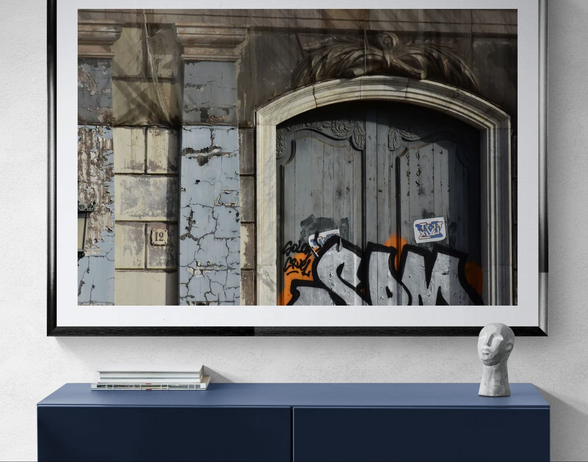 Capture the soulful charm of Old Madrid with this striking architectural photograph. Taken in the heart of Spain’s capital, this image highlights a beautifully aged doorway adorned with ornate carvings, peeling paint, and bold urban graffiti. The tension between the building’s historical craftsmanship and the modern street art creates a compelling visual story of time, culture, and contrast.